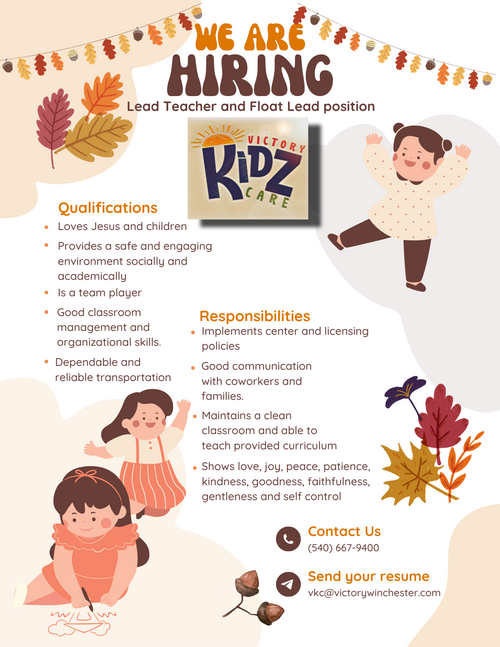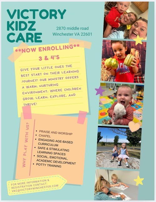 Monday-Thursday, 9-4 PM, or email to vkc@victorywinchester.com.Call us at 540-667-9400 ext 125 with any questions or email our director, Laura Grace, at vkc@victorywinchester.com